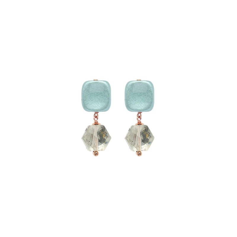 Orecchini in legno d’ulivo di recupero laccato e smaltato a mano, argento 925 placcato oro rosa e mix di pietre naturali.