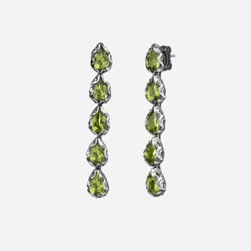Una pietra a goccia a lobo dal taglio sfaccettato e quattro pietre a goccia pendenti che arricchiscono l'accessorio.