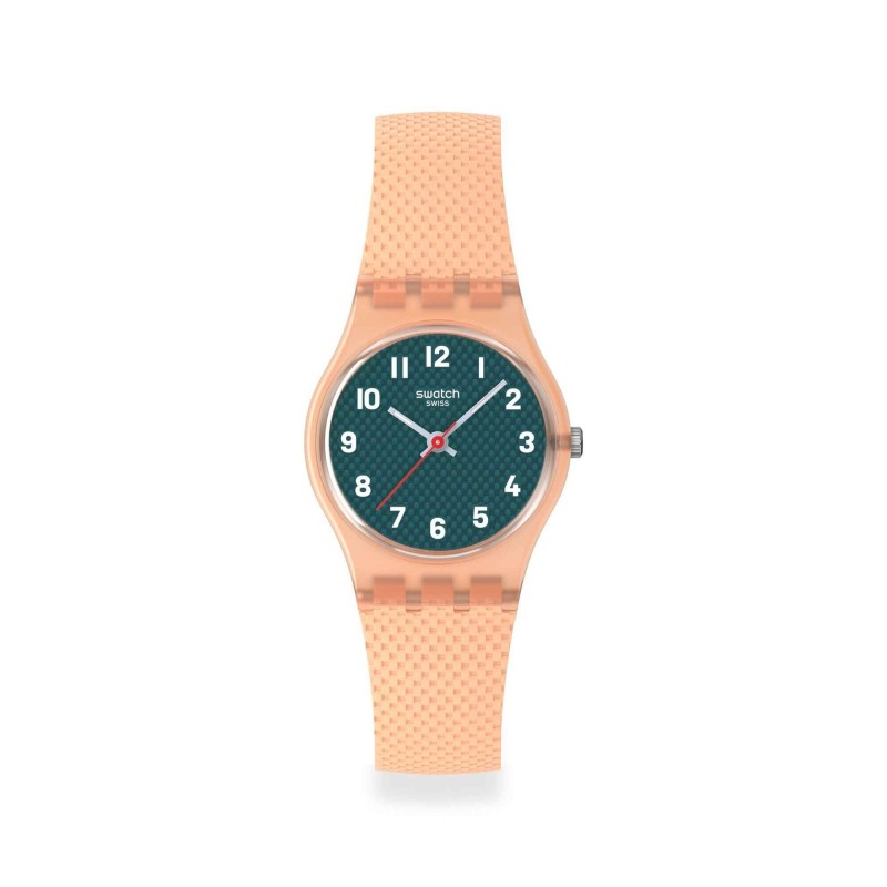 Questo orologio presenta un quadrante testurizzato verde scuro con numeri stampati bianchi, lancette delle ore e dei minuti azzurre che si illuminano al buio e una lancetta dei secondi rossa in una cassa trasparente e opaca arancione chiaro. Il cinturino testurizzato arancione chiaro opaco è completato da un passante arancione chiaro opaco e da una fibbia arancione chiaro trasparente e opaca.