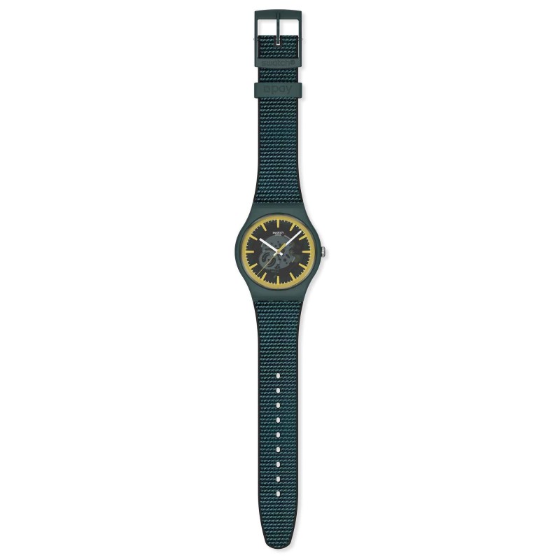Questo orologio Swatch Pay presenta un quadrante verde scuro trasparente con indici delle ore stampati gialli, tacche dei minuti stampate bianche e anello esterno stampato giallo. Le lancette delle ore e dei minuti bianche che si illuminano al buio e una lancetta dei secondi gialla indicano l’ora sotto il vetro biosourced in una cassa opaca verde scuro sempre di origine biologica. Il cinturino nero opaco con inserto in tessuto verde scuro è completato da un passante e dalla fibbia verde scuro opaco.