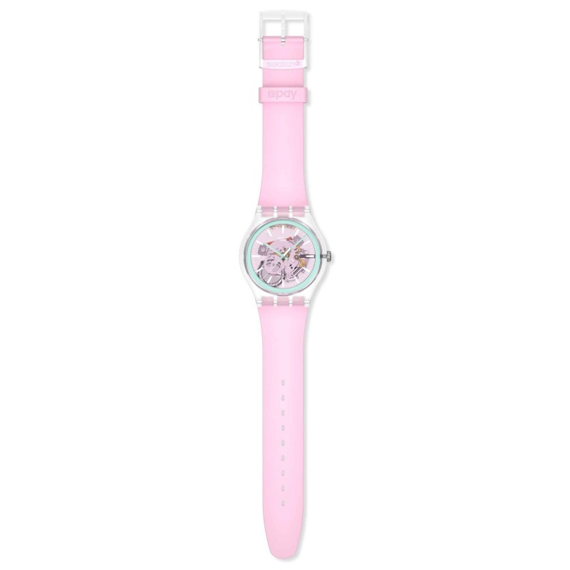 Questo orologio Swatch Pay presenta un quadrante rosa trasparente con indici delle ore e tacche dei minuti stampati bianchi e un anello esterno stampato verde chiaro. Le lancette delle ore e dei minuti verdi chiare che si illuminano al buio e una lancetta dei secondi bianca indicano l’ora sotto il vetro biosourced in una cassa trasparente opaca sempre di origine biologica. Il cinturino rosa opaco è completato da un passante coordinato e da una fibbia trasparente opaca.