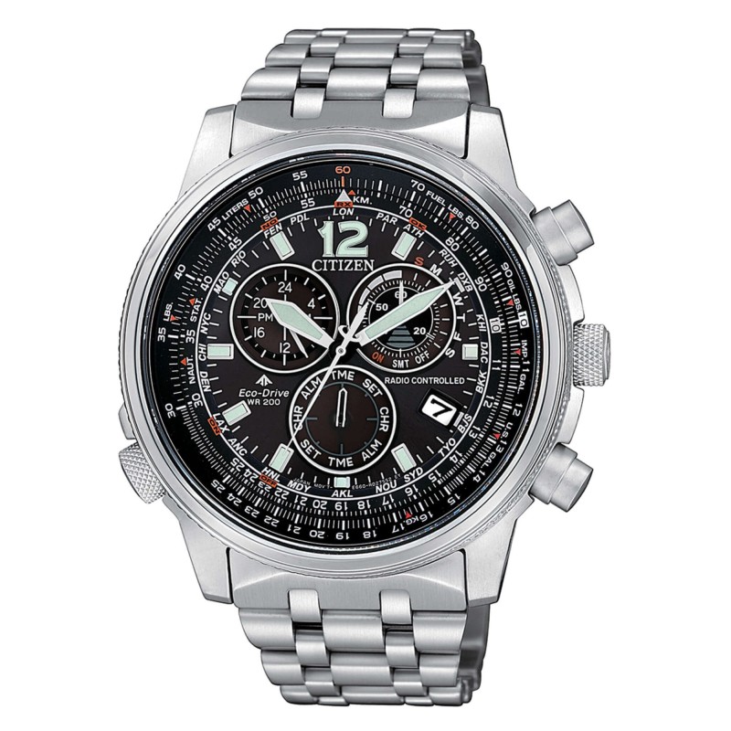 Radiocontrollato a 5 canali: ricezione del segnale orario USA, Europa, Cina, Giappone. World timer con orario di 24 citta' del mondo e ora UTC. Allarme. Cronografo.