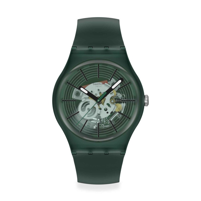 Questo orologio presenta un quadrante verde scuro trasparente con anelli stampati verde scuro, indici delle ore stampati neri, lancette delle ore e dei minuti nere che si illuminano al buio e una lancetta dei secondi verde scuro, il tutto racchiuso in una cassa biosourced trasparente e opaca verde scuro con vetro sempre di origine biologica. Il cinturino biosourced verde scuro opaco è completato da un passante coordinato e da una fibbia verde scura trasparente e opaca.