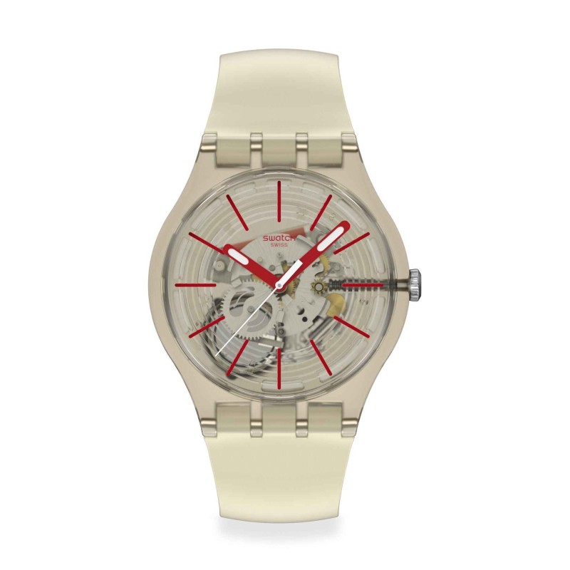 Questo orologio presenta un quadrante beige trasparente con anelli stampati beige, indici delle ore stampati rossi, lancette delle ore e dei minuti rosse che si illuminano al buio e una lancetta dei secondi bianca, il tutto racchiuso in una cassa biosourced trasparente e opaca beige con vetro sempre di origine biologica. Il cinturino beige opaco è completato da un passante coordinato e da una fibbia trasparente e opaca beige.