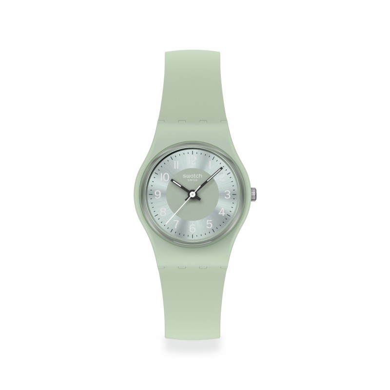 Questo piccolo orologio presenta un quadrante verde chiaro con finitura spazzolata soleil, un punto interno stampato in verde, numeri a stampa bianca e una minuteria a stampa nera. Le lancette delle ore e dei minuti nere con effetto fosforescente e la lancetta dei secondi bianca indicano l'ora. La cassa verde opaco è abbinata a un cinturino verde sfumato e verde chiaro opaco, con passante e fibbia verde chiaro opaco.
