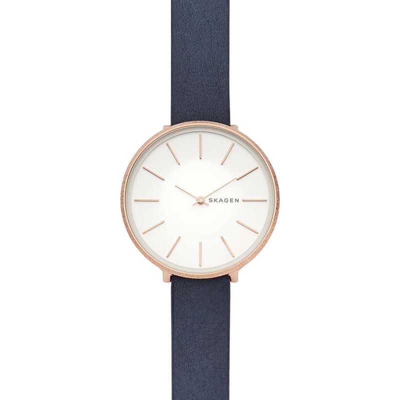Orologio da donna con cassa in acciaio pvd rosè e cinturino in pelle blu.