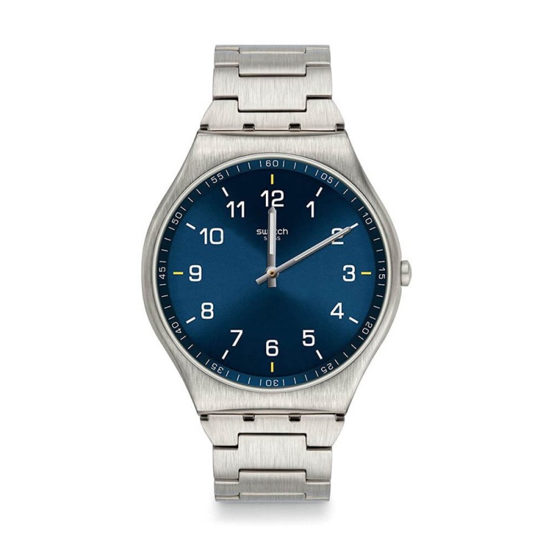 L’ultra sottile SKIN SUIT BLUE (SS07S106G) presenta un bracciale in metallo spazzolato e una cassa coordinata. Le lancette argentate rivestite con Swatch Glow brillano sul quadrante spazzolato blu.
