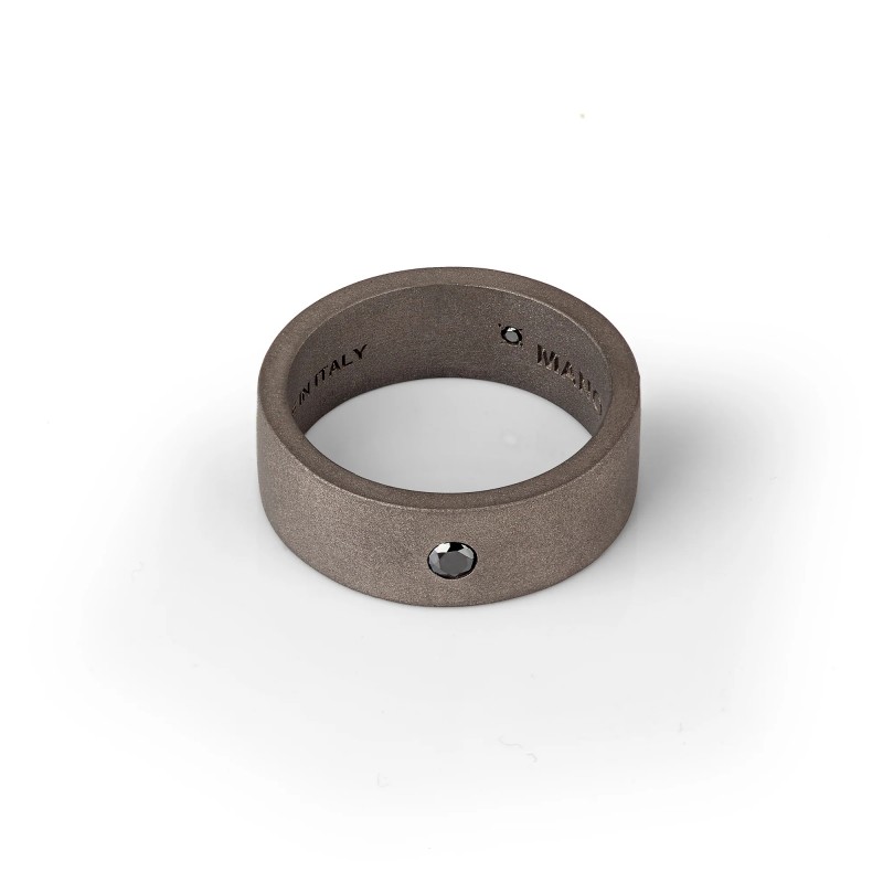 Anello uomo Linea Solitari in titanio e diamanti black. Un elegante solitario dalla linea moderna interamente prodotto in titanio. Il diamante black, incastonato al centro della parte superiore dell'anello ha una caratura di 10 punti, all'interno del gambo si trova il testimonial del marchio MANO|J.: l'immancabile diamante black da 1 punto.