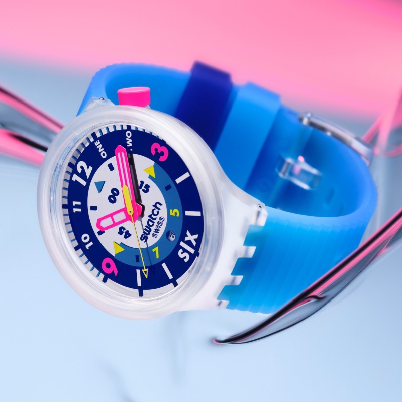Questo orologio oversize rétro si ispira a uno Swatch LADY anni '90: lo HIELO da collezione (LK146). Le sue caratteristiche di spicco includono un quadrante con numeri stampati multicolori, numeri scritti, indici, effetto specchio e datario a ore 6. L’orario è indicato da lancette delle ore e dei minuti rosa che si illuminano al buio e da una lancetta dei secondi gialla. La cassa trasparente opaca con lunetta coordinata è completata da un cinturino blu trasparente opaco testurizzato con un passante blu scuro trasparente opaco, un passante blu trasparente opaco e una mezza fibbia trasparente opaca.