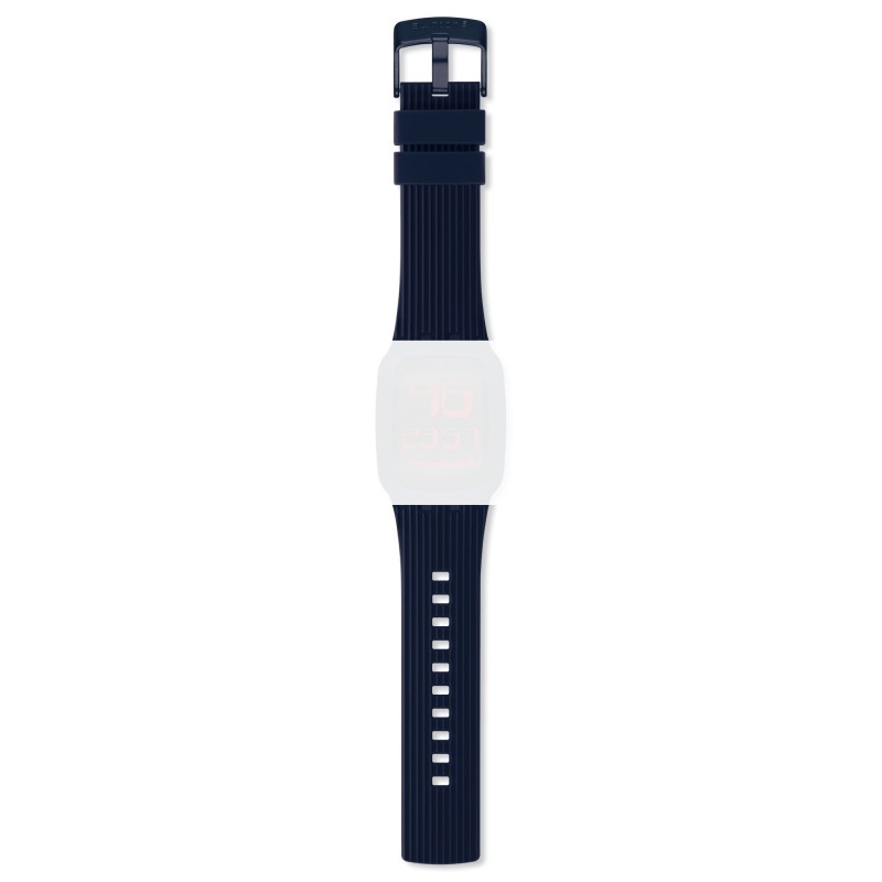 Cinturino in silicone texturizzato blu notte con fibbia in alluminio anodozzato blu per modello Swatch Touch.