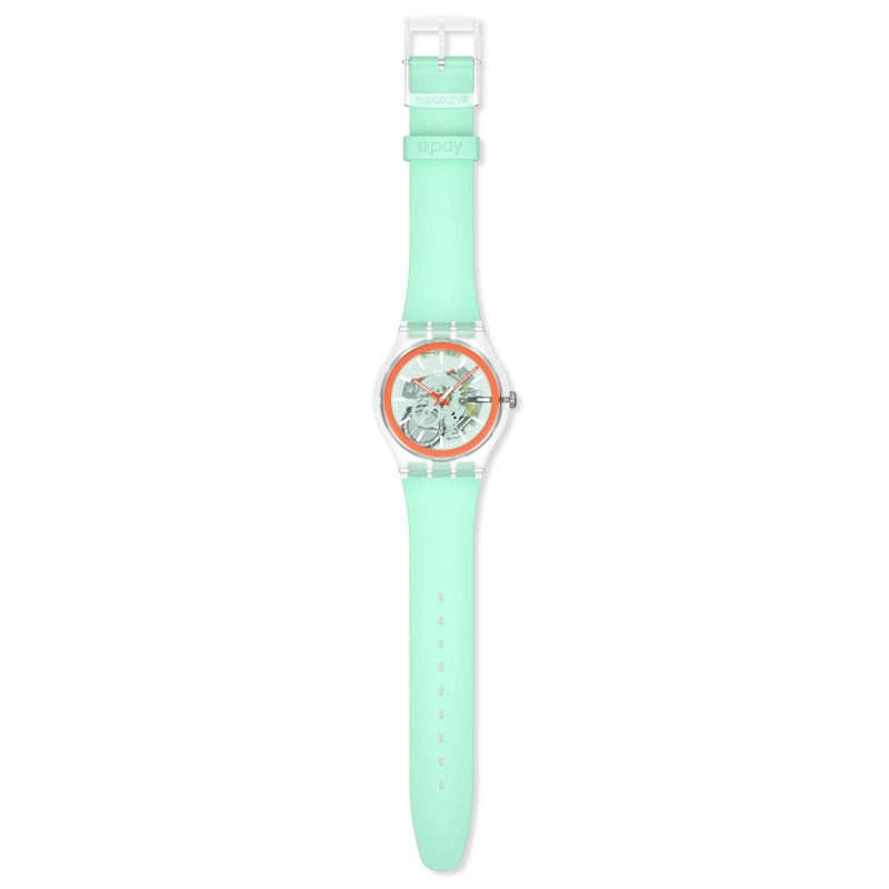 Questo orologio Swatch Pay presenta un quadrante verde chiaro trasparente con indici delle ore e tacche dei minuti stampati bianchi e un anello esterno stampato arancione. Le lancette delle ore e dei minuti arancioni che si illuminano al buio e una lancetta dei secondi bianca indicano l’ora sotto il vetro biosourced in una cassa trasparente opaca sempre di origine biologica. Il cinturino verde chiaro opaco è completato da un passante coordinato e da una fibbia trasparente opaca.