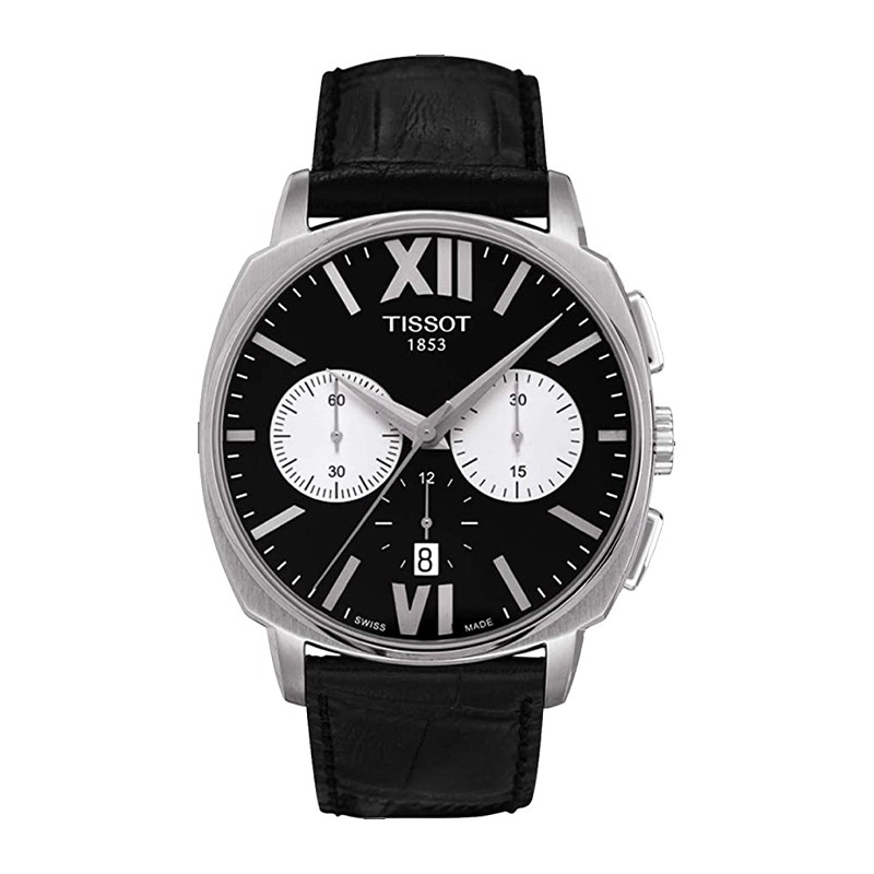 Elegante cronografo da uomo in acciaio con movimento automatico swiss made a vista sotto vetro zaffiro antigraffio, con quadrante nero e contatori bianchi, indici e numeri romani XL in acciaio, cassa sagomata in acciaio spazzolato e lucido, vetro zaffiro antiriflesso, datario al 6, impermeabile a 5 atm., cinturino in pelle con chiusura deployante a tre lame, garanzia due anni