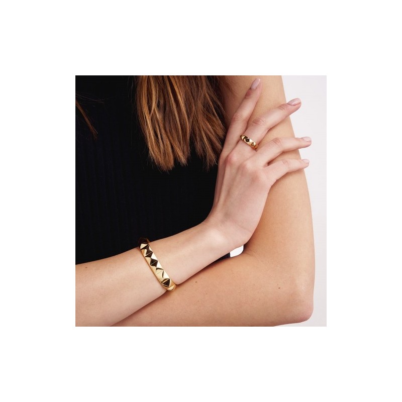 Bracciale rigido aperto in bronzo lucido con bagno in giallo 24 kt con piramidi in rilievo. Originale e grintoso, questo bangle aperto è reso unico dalla linea rock delle piramidi che si susseguono.