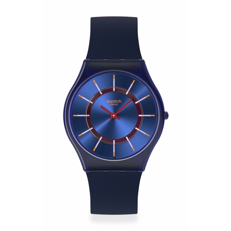 Questo orologio ultrapiatto presenta un quadrante blu scuro spazzolato soleil con un anello interno stampato in rosso scuro, indici viola chiaro e arancione a doppia tonalità e lancette delle ore e dei minuti rosse, il tutto sotto un vetro biosourced. La cassa blu scuro trasparente opaco è abbinata a un cinturino blu scuro e rosso scuro opaco e sfumato, con passante e fibbia rosso scuro trasparente e opaco.