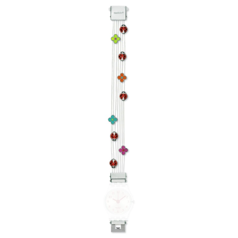 Cinturino con fili di nylon trasparenti e charmes smaltati a forma di fiori e coccinelle, con attacchi in acciaio e sgancio a pressione per modello Swatch Original Lady.