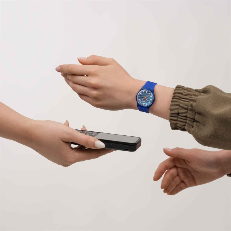 Questo orologio Swatch Pay presenta un quadrante blu trasparente con righe stampate azzurre e numeri stampati bianchi. Le lancette delle ore e dei minuti arancioni che si illuminano al buio e una lancetta dei secondi gialla indicano l’ora sotto il vetro biosourced in una cassa trasparente e opaca blu sempre di origine biologica. Il cinturino blu trasparente e opaco è completato da un passante e dalla fibbia coordinati.