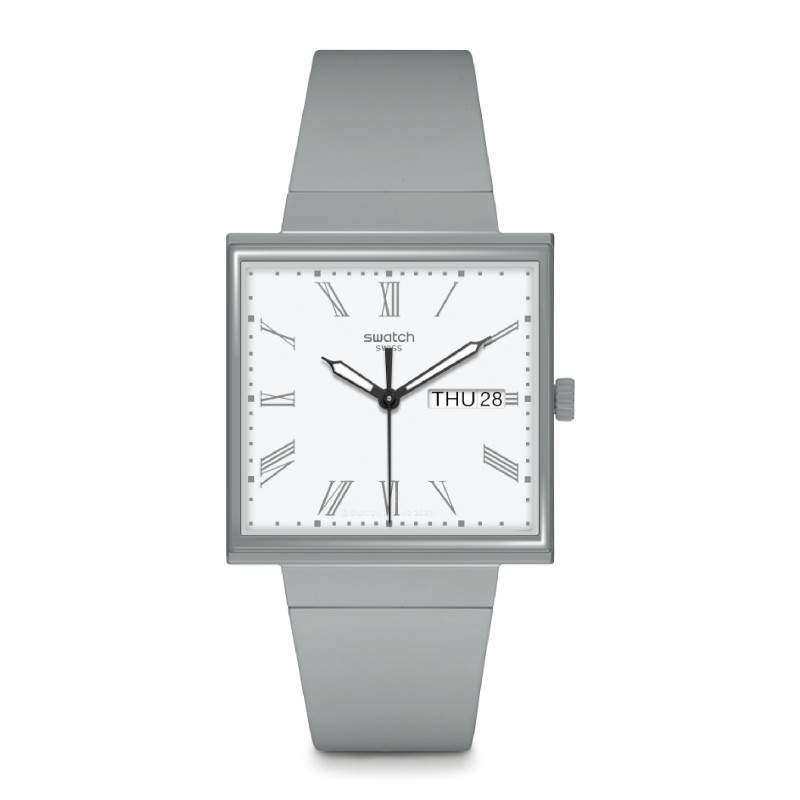 La cassa quadrata dell'orologio BIOCERAMIC è caratterizzata da un vetro biosurced edge-to-edge che permette una visione laterale delle lancette dell'orologio con numeri romani. Il quadrante quadrato è dotato di lancette che si illuminano al buio e a ore 3 di una finestra con la data del giorno. Il quadrante è completato da un cinturino integrato in materiale biosurced. Un copribatteria stampato sul retro raffigura uno dei quadranti che hanno ispirato questo orologio quadrato grigio.