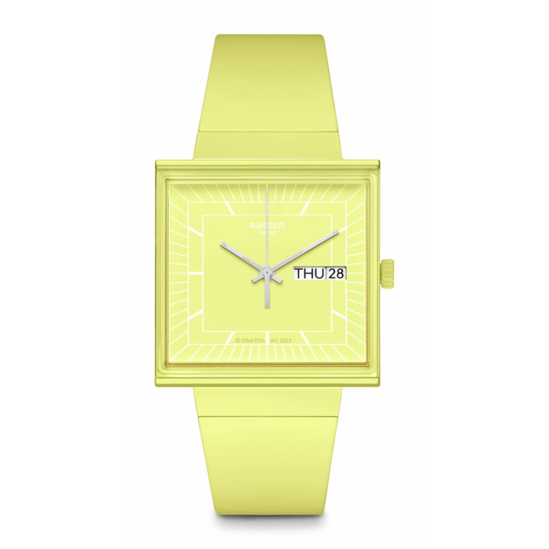 La cassa quadrata di quest’orologio BIOCERAMIC giallo limone è dotata di un vetro biosourced edge-to-edge che permette una vista laterale degli indici bianchi stampati dell'orologio. Il quadrante quadrato è dotato di lancette argentate fosforescenti e di una finestra per la data a ore 3. Il quadrante è completato da un cinturino biosourced integrato con fibbia BIOCERAMIC. Il coperchio della batteria stampato sul retro raffigura una vista frontale dell'orologio.