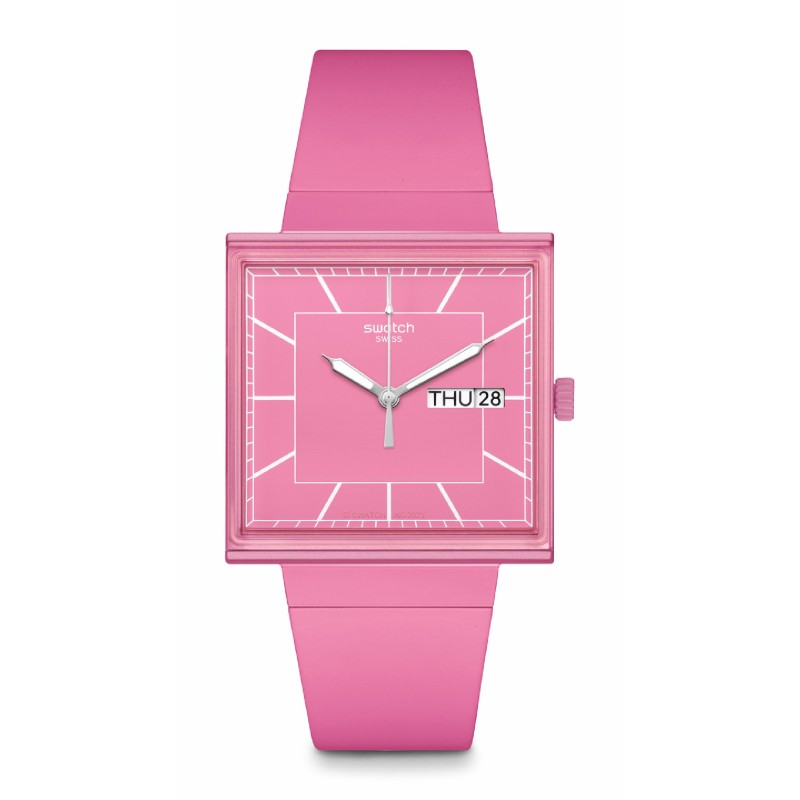 La cassa quadrata di quest’orologio BIOCERAMIC rosa è caratterizzata da un vetro biosourced edge-to-edge che permette una vista laterale degli indici bianchi stampati dell'orologio. Il quadrante quadrato è dotato di lancette argentate fosforescenti e di una finestra per la data a ore 3. Il quadrante è completato da un cinturino biosourced integrato con fibbia BIOCERAMIC. Il coperchio della batteria stampato sul retro raffigura una vista frontale dell'orologio.