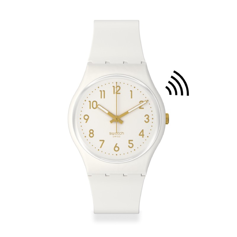 l quadrante bianco di questo orologio di classe presenta numeri e lancette color oro che si illuminano al buio. Il cinturino bianco opaco aggiunge un tocco di stile. Questo orologio è abilitato per SwatchPAY!.