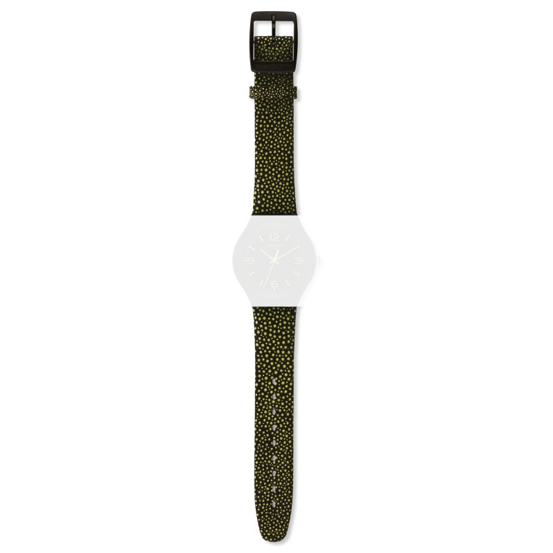 Cinturino in pelle stampa razza nera con finitura gialla e fibbia in alluminio anodizzato nero per modello Swatch Irony Big.