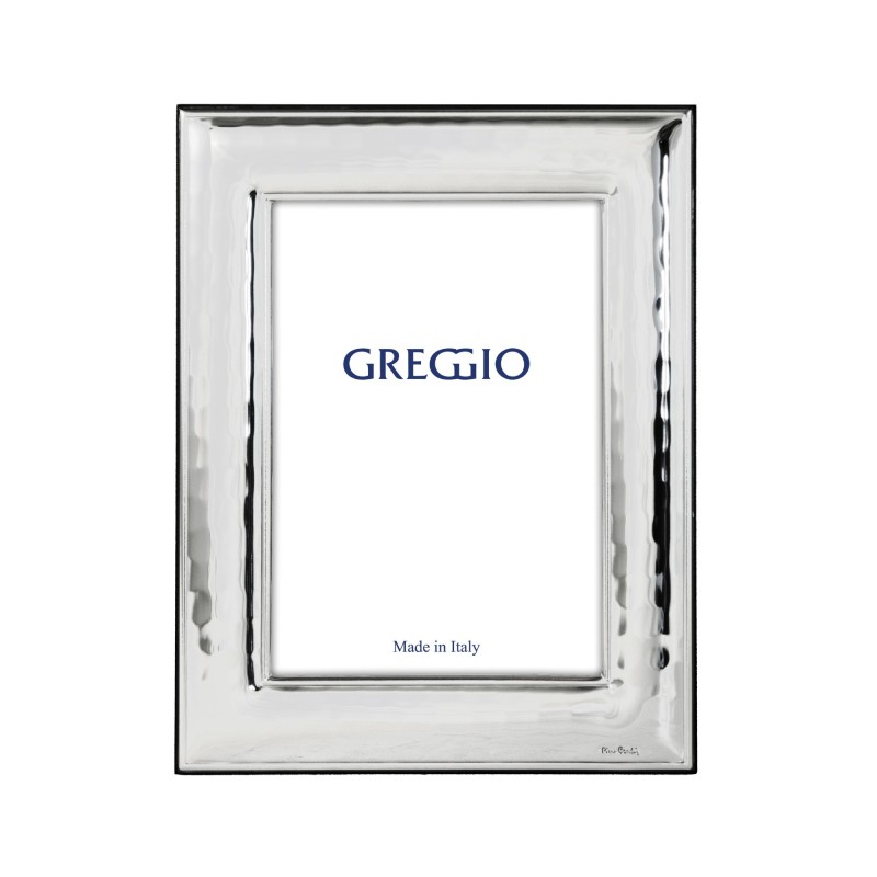 Cornice portafoto da tavolo in lastra argentata con finitura martellata e bombata.